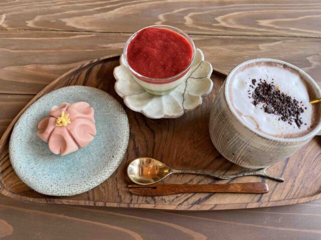 桜の練り切りと三層のプリン(下から抹茶、甘酒、苺)