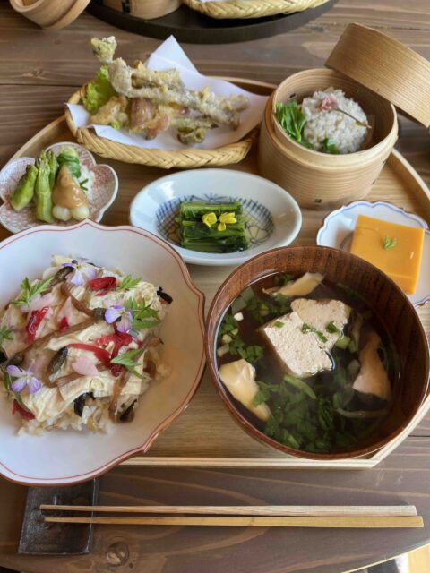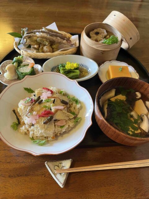 春らしくちらし寿司にはつくしが乗ってたり、野蒜のグルグルがあったり、ツワの天麩羅も、、、