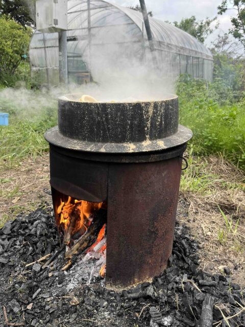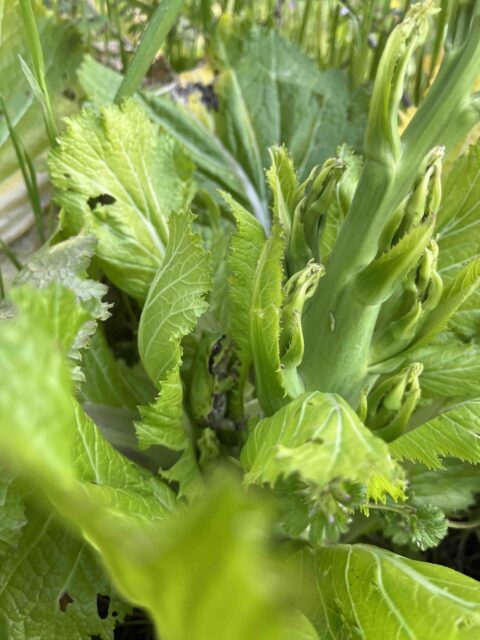 「子持ち高菜」は董立ちが進み、「つぼみな」としては収穫できなくなってきましたが、株全体を収穫して葉も、董も、茎もぜーんぶ美味しくいただけます